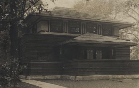 The Charles A. Brown house features a simple, square-shaped plan, clapboard siding, and sash windows—some of the last to appear in Wright’s work. A wide veranda at the front of the house displays a vast cantilevered roof that interrupts the box-like structure of the residence and opens the house to its surrounding environment.
