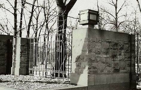 Edward C. Waller was an early client and patron of Frank Lloyd Wright. Wright designed two apartment complexes for Waller in 1895, and remodeled his home in 1899. Waller subsequently commissioned the architect to design entrance gates, as well as a poultry house and stable on his River Forest property. The entrance gates are all that remain of this project. Block-like piers connected by wrought iron fencing and topped with gaslight lanterns mark the entrance to Waller’s former estate. The rugged texture of the rusticated limestone of the piers lends them a natural appearance that is tempered by the pylons’ strict rectilinearity and the smooth surfaces of their concrete bases and dressed-stone tops. Winslow Bros. Ornamental Ironworks—a company owned and operated by William Winslow, another of Wright’s clients and Waller’s friend and neighbor—may have fabricated the cast iron gates found at the entrance. The lanterns that now adorn and illuminate the entrance gate are reproductions that were wired for electricity.