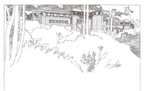 The William A. Glasner house is a one-story residence situated on the edge of a sloping ravine on Chicago’s North Shore. Asymmetrical in plan, and broad in appearance, the house responds to the irregularities of the picturesque landscape in which it sits. The dark board and batten siding that covers the lower portion of the structure is heavy in appearance and helps root the structure in its wooded site. The octagonal library and sewing room are evocative of the Chauncey Williams and George Furbeck houses, as well as Wright’s own studio in Oak Park. The plan indicates that a third octagonal space, a detached tea-house, was intended to be connected to the main structure by an arched bridge straddling a gulley. However, the tea-house was never realized. There is no division between the living and dining rooms, a characteristic that is often associated with architecture of the interwar period and, more specifically, Wright’s single-story Usonian houses of the mid-1930s.