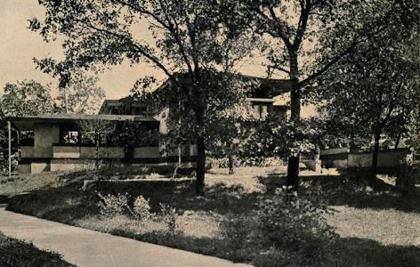 The Oscar Steffens house occupied an elevated position on land overlooking Lake Michigan. Leaded glass windows with tinted chevron patterns afforded views and referenced the colors of the nearby lake. The two-story living room featured a balcony in a similar configuration as that found at the Isabel Roberts house. The living room terminated in a bay with windows that stopped short of the house’s roofline to accommodate recessed transom lights below the roof’s soffits. The entrance was partially concealed at the side of the living room, and the primary living spaces of the house met to form a cross shape centered on a prominent fireplace. The ground floor service quarters, located at the rear of the house, were recessed below ground level to accommodate four bedrooms on the upper story. A prominent water table rooted the structure to its site.